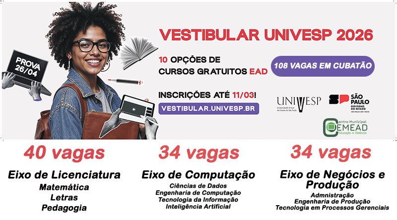 O CEMEAD comunica que as inscrições para o Vestibular Univesp 2026 já estão abertas. Para este processo seletivo, o Polo de Cubatão oferece um